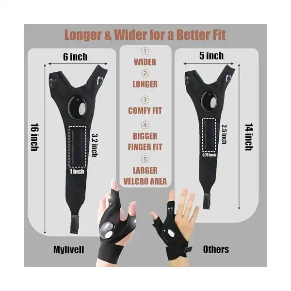 مقاس واحد يناسب معظم الأشخاص، قابل للتمدد للأيدي الكبيرة – قفازات المصباح اليدوي LED، مصنوعة من البوليستر، تأتي مع أشرطة فيلكرو طويلة قادرة على التمدد وتناسب معظم أصابع ومعصم الرجال أو النساء. تم تصميم هذه الهدية العملية لاستبدال المصابيح اليدوية التقليدية المحمولة باليد، وستصبح يد المساعدة الثالثة عند الصيد والجري الليلي والتخييم والمشي لمسافات طويلة وتمشية الكلاب والصيد والدوريات وركوب الدراجات وما إلى ذلك. مع القفازات، يمكنك توجيه الضوء إلى أي شيء تعمل عليه بيديك!