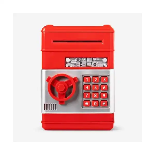 حصالة نقود إلكترونية صغيرة بتصميم ماكينة صراف آلي وخزنة آمنة للنقود والعملات المعدنية بقفل برمز سري للأطفال الأولاد والبنات من كيدز زون، (لون أحمر)