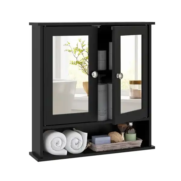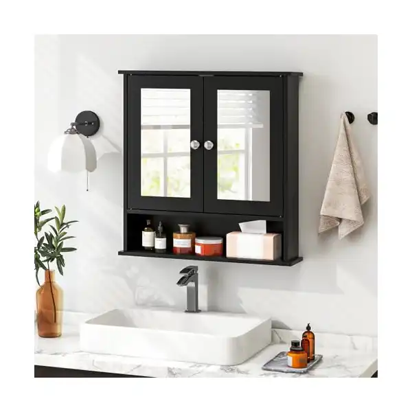 دولاب حمام يثبت على الحائط مع أبواب بمرايا مزدوجة، منظم خشبي معلق مع أبواب ورفوف، خزانة بمرايا حائط للحمام من تانجكولا (أسود),