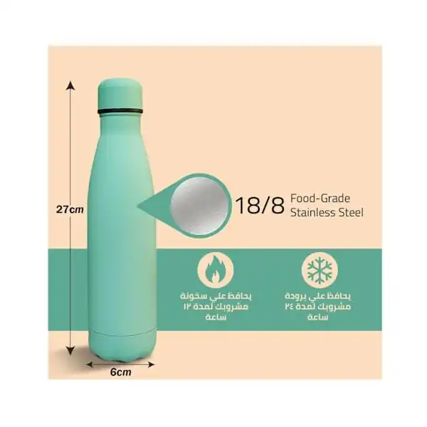 زجاجة مياه معزولة بطبقة مزدوجة من الستانلس ستيل، مج حراري قابل لاعادة الاستخدام للمشروبات الساخنة والباردة، 500 مل. لون أخضر مينت),
