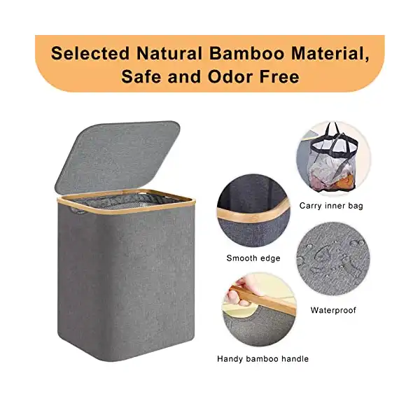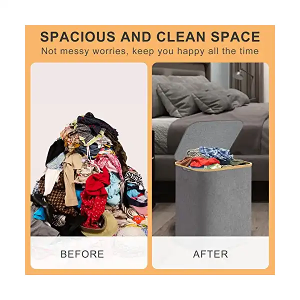 سهل الحمل: يوجد مقبضين من البامبو على جانب سلة الغسيل مما يجعل من السهل عليك نقلها إلى غرفة الغسيل أو غرفة النوم أو غرفة الأطفال. يعمل الغطاء العلوي لسبت الغسيل على منع دخول الغبار والحد من انتشار الروائح الكريهة. توفر لك بيئة مرتبة.