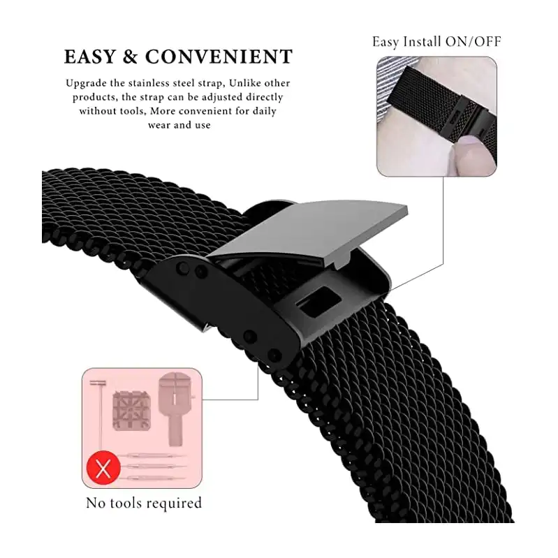 التبديل في ثوانٍ: تسمح لك قضبان موبيليك سريعة الفك بتبديل الأساور في ثوانٍ لتكمل إطلالة ملابسك ويمكن جمعه ومطابقته مع أساور الجلد والقماش والسيليكون الأخرى. ببساطة حرّك مقبض الفك السريع بالإصبع، كما هو موضح في الرسم البياني.