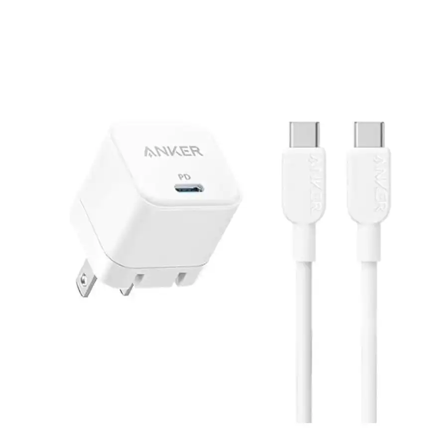 شاحن سريع مع قابس قابل للطي وكابل USB-C إلى C من انكر، مناسب لسلسلة آيفون 15 وأجهزة جالاكسي وموبايلات بكسل واي باد وغيرهم، لون أبيض، 20 وات