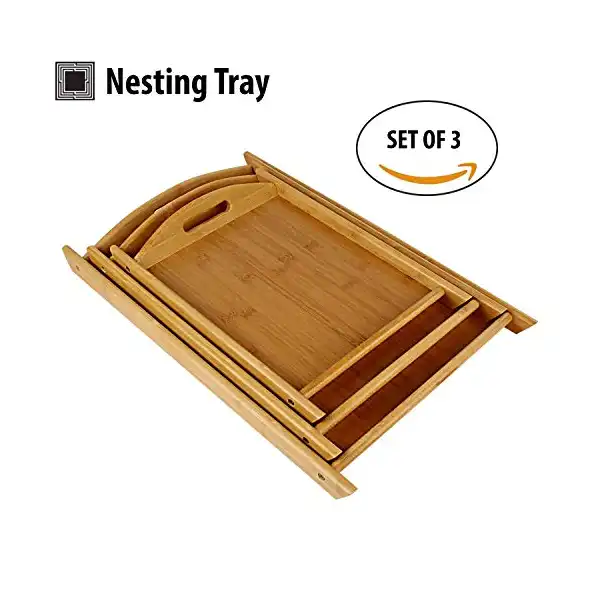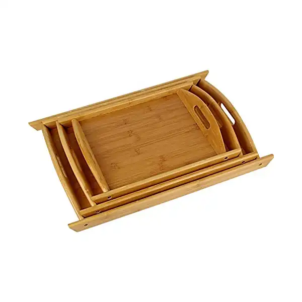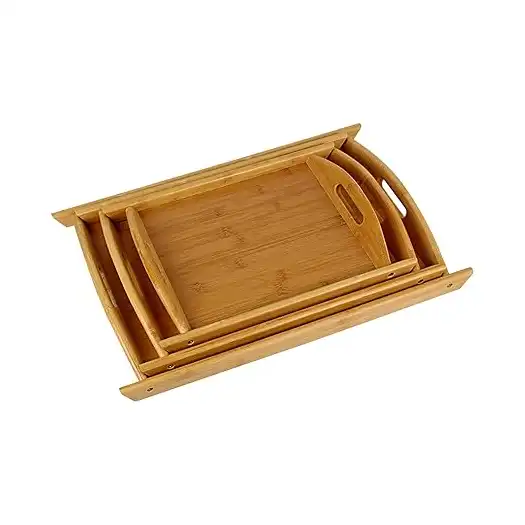 طقم صواني تقديم خشب من الخيزران بليكيس® 3 قطع أطباق مقبلات يدوية الصنع بمقابض مستطيلي ذهبيتصميم متين: صينية تقديم مصنوعة من خشب شيشام سادة مع حافة من الخيزران الطبيعي، مصنوعة يدويًا يمكنها تحمل الاستخدام اليومي.