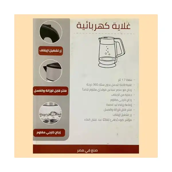 فلتر قابل للإزالة والغسل: يساعد في تنقية المياه من الشوائب والرواسب، ويمكن إزالته وتنظيفه بسهولة للحفاظ على نظافة الغلاية وجودة المياه. * مفتاح تشغيل/إيقاف: يوفر تحكماً بسيطاً ومباشراً في تشغيل الغلاية وإيقافها. * مؤشر ضوئي ينطفئ تلقائياً عند غليان الماء: ميزة أمان مهمة تعمل على إيقاف تشغيل الغلاية تلقائياً بمجرد وصول الماء إلى درجة الغليان، مما يمنع الجفاف وتوفير الطاقة.