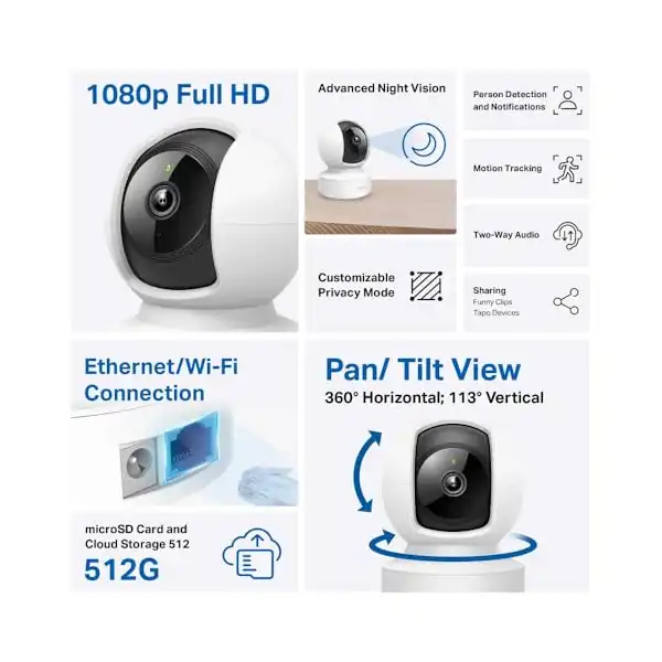 لماذا كاميرا مراقبة منزلية بخاصية الدوران والإمالة من تابو، C202، لاسلكي، أبيض/أسود؟