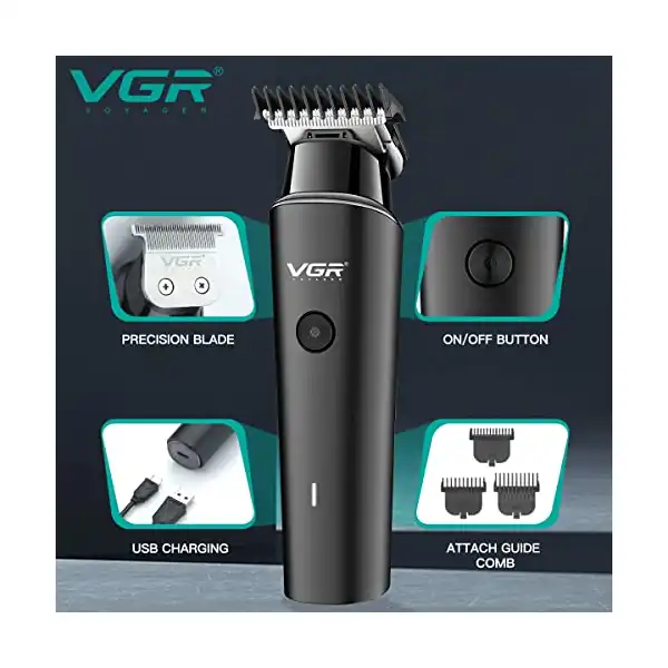 ماكينة تشذيب الشعر الاحترافية اللاسلكية القابلة لاعادة الشحن V-933 من في جي ار ببطارية ليثيوم 2000 مللي امبير وكابل شحن USB وشفرة دقيقة وزر تشغيل – ايقاف و3 امشاط توجيهية للرجال وقت التشغيل: 500