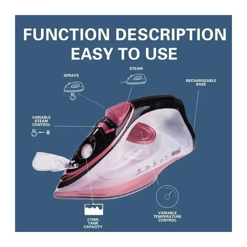 أداء عالي الطاقة: توفر مكواة البخار 2200 واط تسخينًا سريعًا وإخراج بخار قوي، مما يضمن الكي الفعال في كل مرة.
