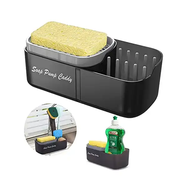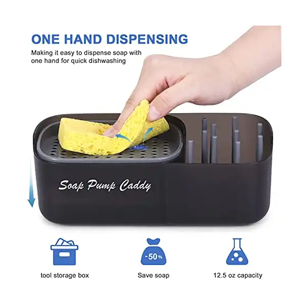 تصميم مطور 2021 – حامل إسفنجة وصابون سائل 3 في 1: تصميم بسيط وعصري يتضمن موزع صابون وحامل صينية إسفنجة وصندوق تخزين الأدوات، مما يجعل توزيع الصابون بيد واحدة لغسل الأطباق بسرعة أمرا سهلا ويسيرا. يأتي صندوق التخزين مع 8 دعامات تسمح لك بضبط حجم المقصورات بحرية لتخزين الإسفنج والفرش وأدوات التنظيف الأخرى. مع تقليل المساحة التي يشغلها الحوض.