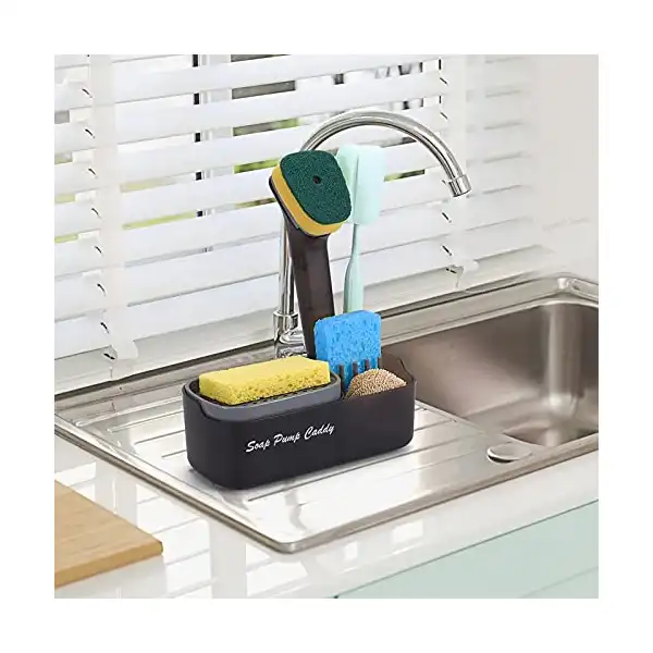 موزع صابون الأطباق للمطبخ 3 في 1 مع إسفنجة مضخة يوضع على سطح الطاولة وبه حامل لغسل ولحوض المطبخ وصندوق تخزين أدوات التنظيف 355 مل
