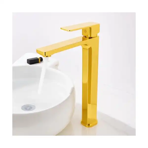 ALHadad high basin mixer 30 cm tall in square gold finish for opulent vessel sinks, geometric metallic height with luxurious appeal